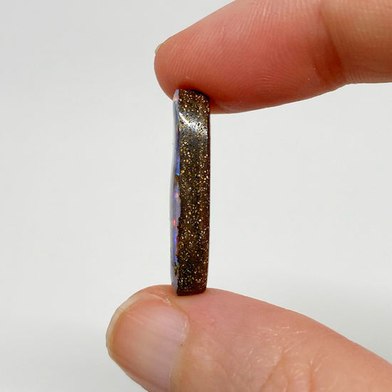A beautiful boulder opal with rainbow colours and a lilac-hued, semi-dark body tone.