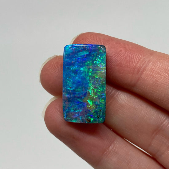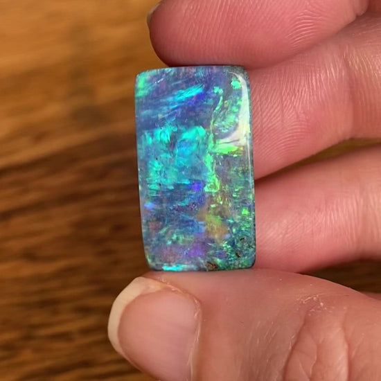 A wonderfully bright blue and green rectangle boulder opal that is quite rare to come across.