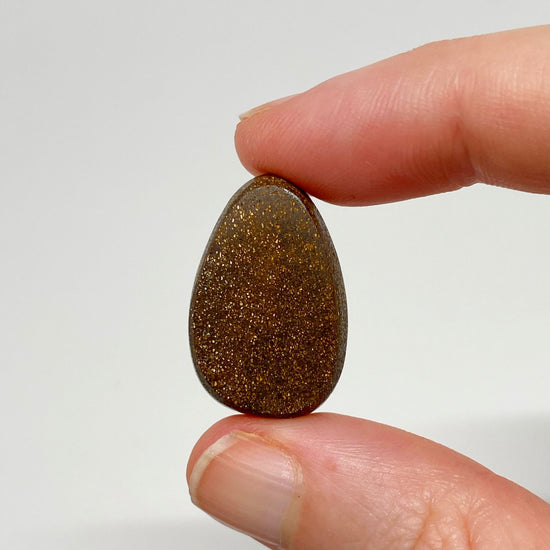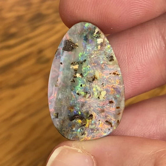 A pear-shaped boulder opal with pink, orange and green colors and a lighter body tone.