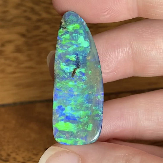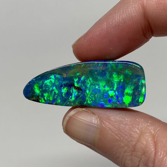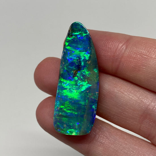 A large, free-form boulder opal with brilliant green-blues and a black body tone. It is such an extraordinary opal!