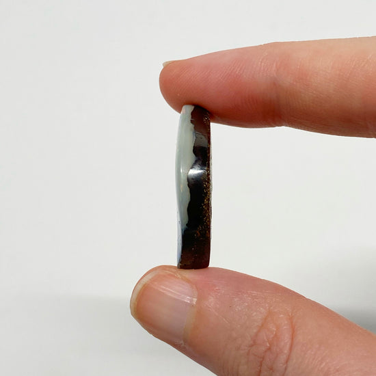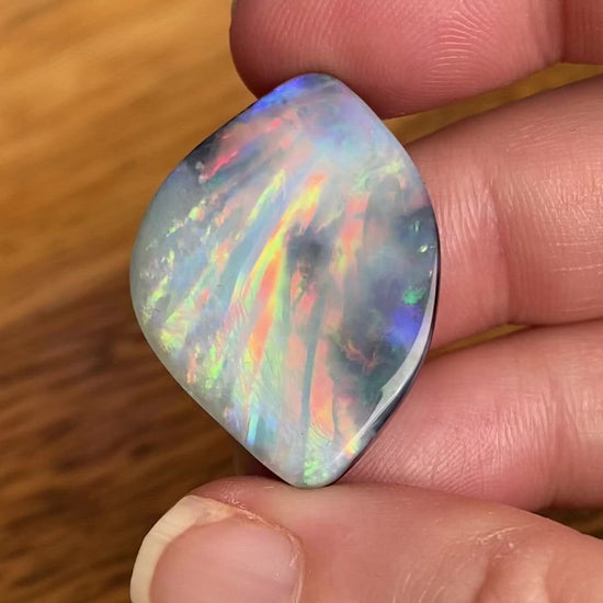 A large free-form oval boulder opal with an extraordinary ribbon pattern.