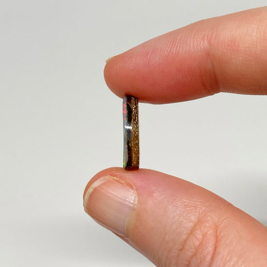 A small, free-form boulder opal with a combination of pinfire colors and a broad flash of pink-red, all on a light body tone.