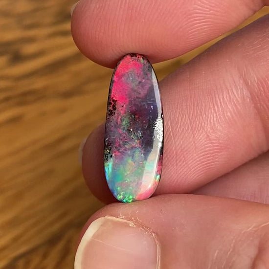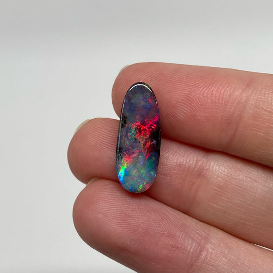 A small free-form boulder opal with strong rainbow colors, including red.