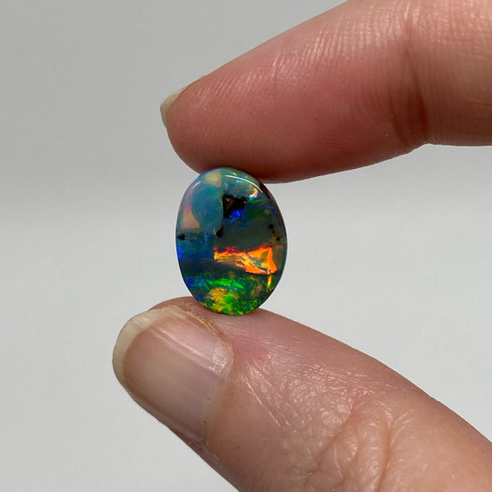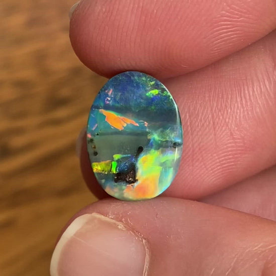 A small boulder opal with broad rolling flashes of color on a dark body tone.