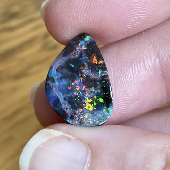 A beautiful free-form matrix boulder opal with brilliant colors on a dark body tone.