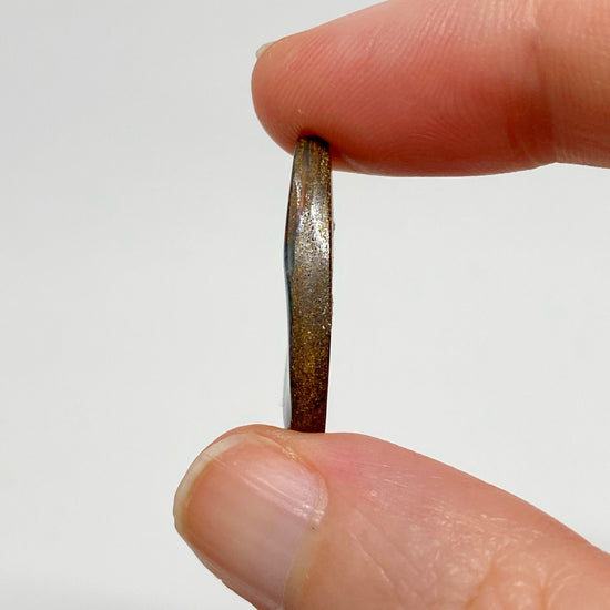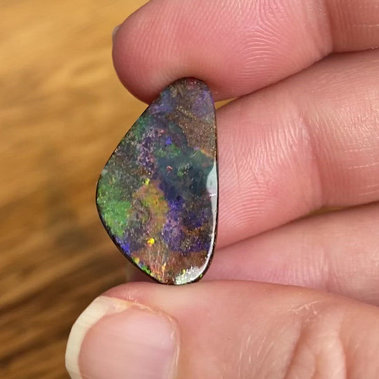A lovely boulder opal with broad flash, rolling colors and a black body tone.