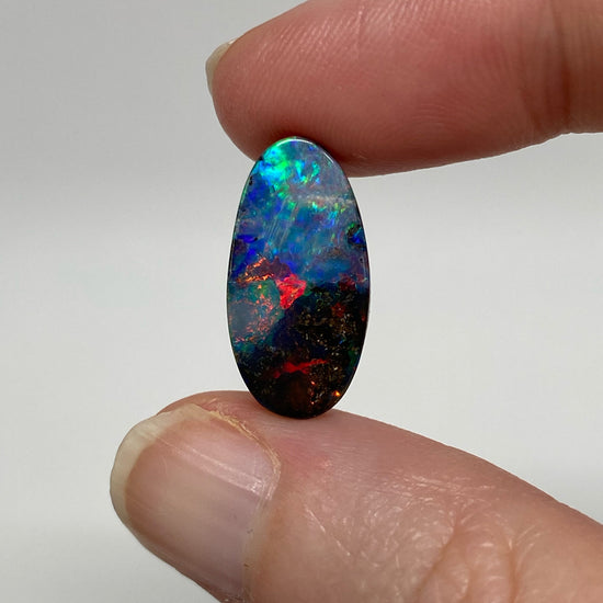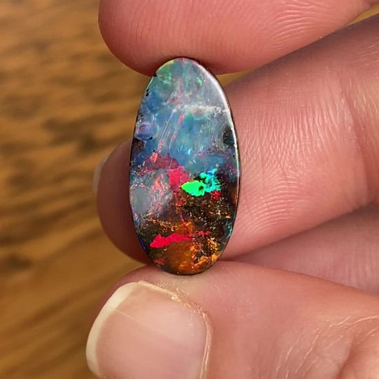 A small oval boulder opal with strong rainbow colors and a fantastic dark to light gradient body tone.